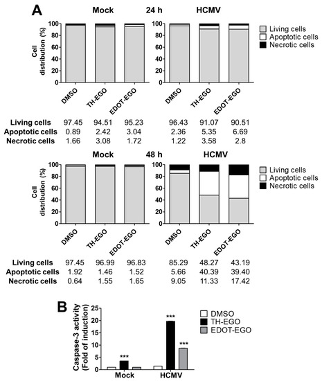 It has been previously reported that SL analogs induce apoptosis in the osteosarcoma cell line U2OS [13]. As apoptosis is also one of the major mechanisms by which hosts evade viral infection [18,30], we assessed the capability of SL analogs to modulate cell-death pathways in HCMV-infected cells via dual staining with annexin V and PI. The binding of Annexin V to phosphatidyl serine is a marker of early apoptosis, while PI only stains the chromatin of cells with compromised plasma membrane and is, therefore, a marker of necrosis. As shown in Figure 4A, at 48 hpi, a significant increase in early apoptosis (annexin+/PI−) and necrosis (annexin+/PI+) was detected in cells treated with TH-EGO (40.39 vs. 5.66; 11.33 vs. 9.05) and EDOT-EGO (39.40 vs. 5.66; 17.42 vs. 9.05) compared to vehicle-treated cells. Moreover, we compared the activity of caspase-3, the final executor of the apoptotic cascade, in cells treated with either TH-EGO, EDOT-EGO or DMSO at different time points after HCMV infection to definitively corroborate the pro-apoptotic effect of SLs on infected cells, as caspases play a central role in mediating various apoptotic responses. Interestingly, significant differences in the ability to activate caspase-3 were observed in SL-treated, infected and non-infected cells (Figure 4B), suggesting that the SLs may specifically trigger caspase activity and promote the apoptotic process only during the course of HCMV infection.