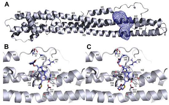 We decided to use an in silico structure-based approach to get clues on the possible molecular targets of the SL-analogs, performing molecular docking simulations on possibly relevant HCMV targets. In the series of HCMV proteins involved in apoptosis inhibition, it was found that vMIA (UL37, prevents the pro-apoptotic cascade), vICA (UL36, prevents caspase-8 activation), UL38 (inhibits apoptosis and facilitates viral replication), IE1 (UL123) and IE2 (UL122) play a key role in initiating lytic cycle gene regulation pathways [16]. We searched the Protein Data Bank [31] for the crystallographic structure of the listed proteins and did not find any of them. Therefore, we tried to model the structures of the missing proteins using homology modeling, and were only able to obtain reliable models for IE1 (see Materials and Methods for further details on IE1). The obtained models were analyzed using the FLAPsite algorithm [26] for the identification of possible binding sites, and the SL analogs were docked in most druggable pockets using GOLD software [32]. Herein, we only report the results that were obtained upon docking the most active SLs, TH-EGO and EDOT-EGO, in IE1. The IE1 structure was modeled on the IE1 of rhesus macaque cytomegalovirus (PDD code 4wic), with which it shares low sequence identity (25%) but high coverage (74%). The model Ramachandran plot reported that 98% of the residues were in favored regions (see Figure S2). The protein model is shown in Figure 5A and displays a relatively elongated structure. The unique pocket, which is large enough to accommodate SL analogs, was identified between helix 2 and the loop connecting helices 3 and 4. TH-EGO and EDOT-EGO were docked in the pocket and their binding pose is reported in Figure 5B,C. Considering that, currently, all the known natural SLs have been shown to have a (R)-configuration at the 2′ position where the D-ring is bound to the rest of the molecule [33], in both cases the (R)-enantiomer of our synthesized analogues was chosen. The score, which was assigned to the poses using the CHEMPLP scoring function, as implemented in the GOLD software, was quite high ([67 and 70, respectively]; [34]) and supported the reliability of the prediction.