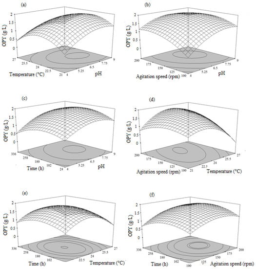 Response surface plots showing the influence of the process variables on the orange pigment yield (OPY): (a) Interaction between temperature and pH; (b) Interaction between agitation speed and pH; (c) Interaction between time and pH; (d) Interaction between agitation speed and temperature; (e) Interaction between time and temperature; (f) Interaction between time and agitation speed.