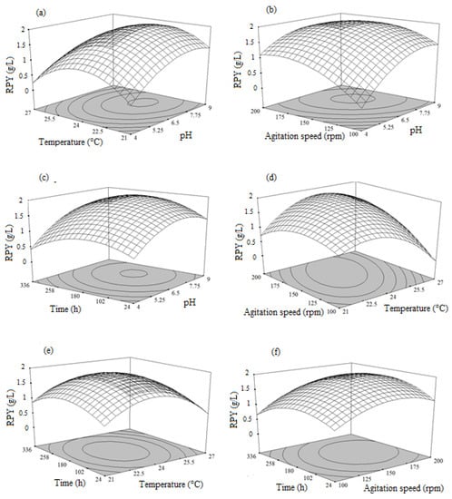 Response surface plots showing the influence of the process variables on the red pigment yield (RPY): (a) Interaction between temperature and pH; (b) Interaction between agitation speed and pH; (c) Interaction between time and pH; (d) Interaction between agitation speed and temperature; (e) Interaction between time and temperature; (f) Interaction between time and agitation speed.