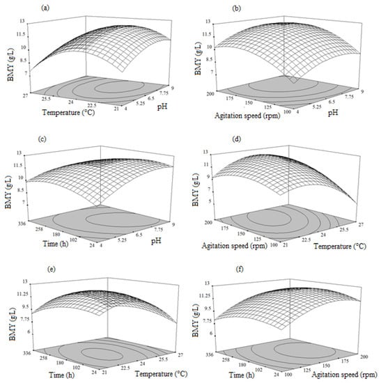 Response surface plots showing the influence of the process variables on dry biomass yield: (a) Interaction between temperature and pH; (b) Interaction between agitation speed and pH; (c) Interaction between time and pH; (d) Interaction between agitation speed and temperature; (e) Interaction between time and temperature; (f) Interaction between time and agitation speed.