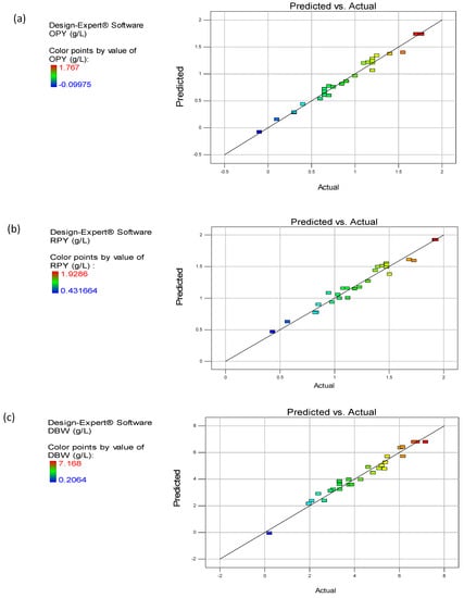 Validation of the polynomial model for (a) OPY, (b) red pigment yield (RPY), and (c) dry biomass weight (DBW) productions from Talaromyces albobiverticillius 30548.