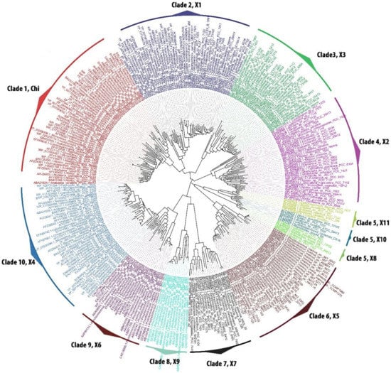 - Capella-Gutierrez, S.; Silla-Martinez, J.M.; Gabaldon, T. Trimal: A tool for automated alignment trimming in large-scale phylogenetic analyses. Bioinformatics 2009, 25, 1972–1973. [Google Scholar] [CrossRef]