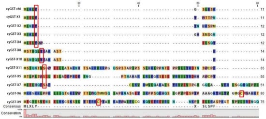 Sequence-based alignment of the representative cyanobacterial GST sequences showing the distribution of conserved signature residues cysteine, serine, and tyrosine highlighted in red boxes at the N-terminal end called the G-site. The alignment was prepared and displayed using the CLC bio-genomic workbench.