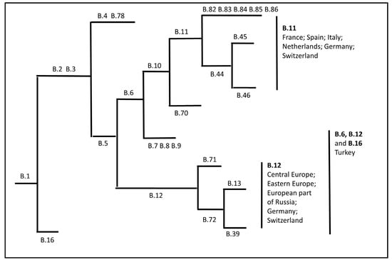 Various phylogenetic analyses of F. tularensis subsp. holarctica isolated in Europe have sought to confirm the hypothesis about the dispersal of the pathogen from east to west in the recent past. Little genetic variation and a low genetic diversity among F. tularensis subsp. holartctica strains simplified monitoring of bacterial spread in the past. The first reported outbreaks in western European countries date back to the first half of the 20th century, when outbreaks occurred in Austria, former Czechoslovakia, Poland, Germany and France []. Based on the phylogenic analysis, four main genetic clades and appropriate subclades are confirmed: B.4, B.6, B.12 and B.16 []. Most of the European isolates belong to the phylogenetic groups B6 and B12 (Figure 1). Each of the clade and additional subclades are predominantly associated with a specific geographical distribution. Phylogenetic analyses show close genetic relationships among F. tularensis isolates on the west part of the European continent. Isolates belong to the Branch 11, which matches subclade B.Br. FTNF002-00, comprising B.45 and B.46 clades. Subclade B. Br. FTNF002-00 has been reported along with France, Spain, Italy, Netherlands, Germany and Switzerland [,,,], while B.12 clade and its subclade B.13 are mostly distributed in Central, Eastern Europe and the European part of Russia. On the border between the European and Asian continents, in the territory of Georgia, the majority of isolates confirmed the B. Br.013 group []. The B13 subclade has been identified in Germany and Switzerland as well [,,]. In the Asian part of Turkey, clades B.6, B.12 and B.16 have been reported [,,]. Therefore, the authors proposed that the spread in the west could occur by expansion of the specific population originating from the east part of the European continent [].