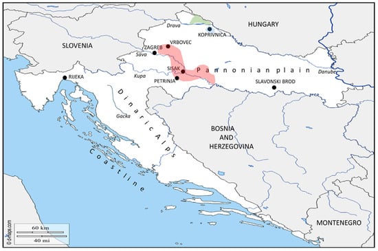While investigating tularemia in Croatia, its geographical location should definitely be taken into consideration. Croatia is located in the northwestern part of the Balkan peninsula, and is geographically diverse, comprising several ecological regions (Figure 2). The coastline is the Mediterranean part of the country, the mountains are a part of the Dinaric Alps, the flat plains are part of the Panonian plain, situated between three huge rivers: Drava, Danube and Sava. Concerning its ecological characteristics, the continental part of Croatia can be compared to a floodplain forest–meadow ecosystem, which has been associated with the ecology of Francisella in Central Europe. In the central and the western part of the European continent, the terrestrial lifecycle of Francisella’s species has been described. Direct contact with infected animals and tick bites are presumed to be the predominant routes of transmission. Terrestrial mammals, especially lagomorphs and rodents, are considered as a potential reservoir of Francisella infections [,,,]. Francisella has been isolated in Europe from different tick genera including Haemaphysalis concinna, Dermacentor reticulatus and Ixodes ricinus [,,,]. In the region of South Moravia in the Czech Republic, the presence of F. tularensis has been associated with the floodplain forest–meadow ecosystem along river courses. Occasional inundations result in an outbreak of tularemia in this endemic region where F. tularensis subsp. holarctica has been isolated from ticks belonging to genus Ixoides []. The ulceroglandular form of the disease in humans has been described as common in Slovakia, Austria, Czech Republic and Germany [,]. In addition, vole species, such as field vole, bank vole and common vole, have been reported as potential vectors and reservoirs of tularemia in Germany and Switzerland []. Kuehn and colleagues reported positive serum samples on F. tularensis subsp holarctica obtained from foxes, raccoon dogs and wild boars captured in Germany []. Concerning the disease’s seasonality, it is driven by a transmission route and the ecological characteristics of the bacteria in different parts of Europe. In Germany, the majority of human cases are reported during summer and autumn months. The cause of this seasonal pattern is primarily related to increased outdoor activities of the population, and thereby, a possible contact with the wildlife [].