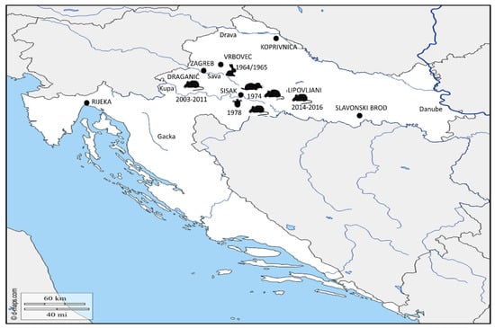 Borčić and his group, at the end of the sixties and the early seventies of the 20th century, performed further epidemiological surveys. The main goal of the study was determination of a “natural foci” of tularemia in Croatia, i.e., areas where the recurrence of the disease can be further expected. Borčić describes tularemia as a “lowland disease” that is closely related to water ecosystems. Thereby, the main emphasis was given to the localities situated in the main lowland and flood plain areas nearby large Croatian rivers. The survey involved villages and towns near great rivers including the Sava, Drava, Danube, Kupa, and Gacka. The characterization of the natural foci also included the determination of the sources of human infection and the transmission route. Altogether, 58,962 persons were involved in the survey. Most of them were schoolchildren and youths. The tularin test and the serological agglutination test were performed, together with a clinical examination and questionnaires. The tularin test was positive in 137 persons. Interestingly, 118 positive persons lived in region of the middle course of the Sava river, and most of them did not recall any contact with hares. Overall, collected data enabled the researchers to define the three main natural foci of tularemia in Croatia: the greatest one was localized southeast of Zagreb, along the left bank of the middle course of the Sava river, in the region of Middle Posavina. Two other smaller areas were in northeastern Croatia, Međimurje and around Koprivnica, near the Drava river (Figure 2) []. In addition, the authors described the seasonal dynamics of tularemia. It started in autumn, reaching its peak during the winter and declining during the summer time []. The predominant clinical forms were ulceloglandular and glandular tularemia [,].