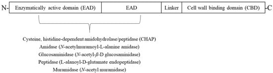 Schematic representation of the modular structure of phage-encoded peptidoglycan hydrolases. Most endolysins contain one or two enzymatically active domain (EAD) in N-terminal those cleave one of the bonds in the bacterial peptidoglycan, and one cell wall binding domain (CBD) involved in host bacterial recognition in C-terminal region. EAD and CBD are connected by a short linker.