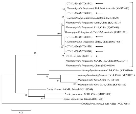 Genomic DNA was extracted from the ticks using a commercial DNeasy Blood & Tissue Kit (Qiagen, Melbourne, Australia), according to the manufacturer’s instructions. The AccuPower HotStart PCR Premix Kit (Bioneer, Daejeon, Korea) was employed for the PCR amplification. Molecular identification of tick species was performed by amplifying the sequence of the mitochondrial cytochrome c oxidase subunit I (COI) gene using specific primers as described previously [].