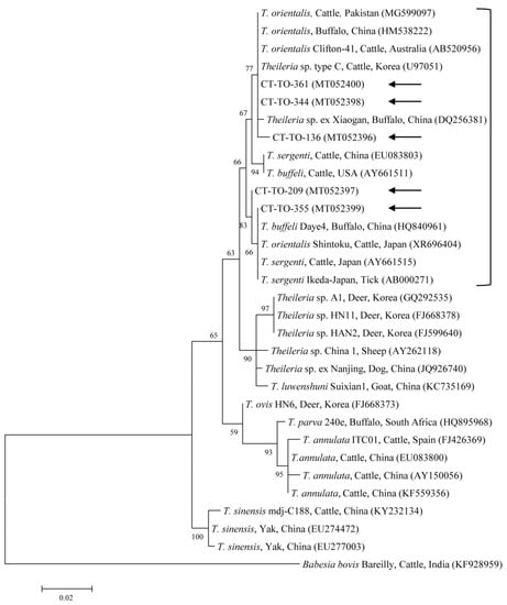 - Kakuda, T.; Shiki, M.; Kubota, S.; Sugimoto, C.; Brown, W.C.; Kosum, C.; Nopporn, S.; Onuma, M. Phylogeny of benign Theileria species from cattle in Thailand, China and the U.S.A. based on the major piroplasm surface protein and small subunit ribosomal RNA genes. Int. J. Parasitol. 1998, 28, 1261–1267. [Google Scholar] [CrossRef]