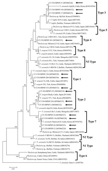 - Park, J.; Han, Y.J.; Han, D.G.; Chae, J.B.; Chae, J.S.; Yu, D.H.; Lee, Y.S.; Park, B.K.; Kim, H.C.; Choi, K.S. Genetic characterization of Theileria orientalis from cattle in the Republic of Korea. Parasitol. Res. 2017, 116, 449–454. [Google Scholar] [CrossRef] [PubMed]