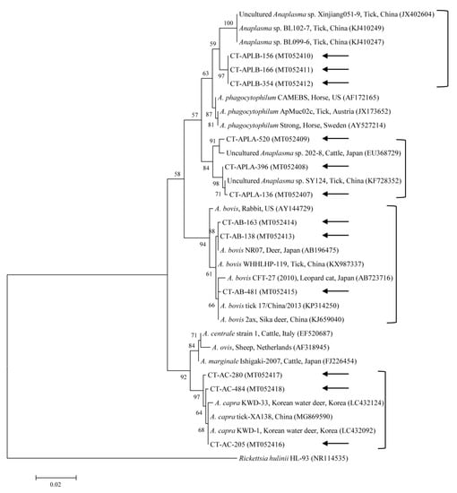 Phylogenetic tree of Anaplasma spp. based on sequences of the 16S rRNA gene. The tree was created using the maximum likelihood method. Black arrows show the sequences analyzed in the present study. Rickettsia hulinii was employed as the outgroup. GenBank accession numbers of other sequences are presented with the sequence name. Branch numbers signify the bootstrap support levels (1000 replicates), and the scale bar shows the number of substitutions for each nucleotide.