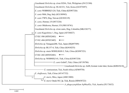 Phylogenetic tree of Ehrlichia spp. based on sequences of the 16S rRNA gene. The tree was created using the maximum likelihood method. Black arrows show the sequences analyzed in the present study. Anaplasma phagocytophilum was employed as the outgroup. GenBank accession numbers of other sequences are presented with the sequence name. Branch numbers signify the bootstrap support levels (1000 replicates), and the scale bar shows the number of substitutions for each nucleotide.