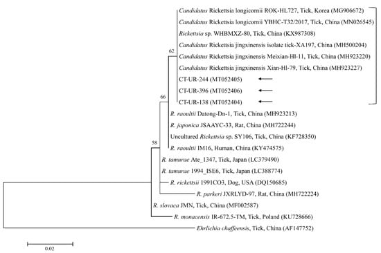 Phylogenetic tree of Rickettsia spp. based on sequences of the 16S rRNA gene. The tree was created using the maximum likelihood method. Black arrows show the sequences analyzed in the present study. Ehrlichia chaffeensis was employed as the outgroup. GenBank accession numbers of other sequences are presented with the sequence name. Branch numbers signify the bootstrap support levels (1000 replicates), and the scale bar shows the number of substitutions for each nucleotide.