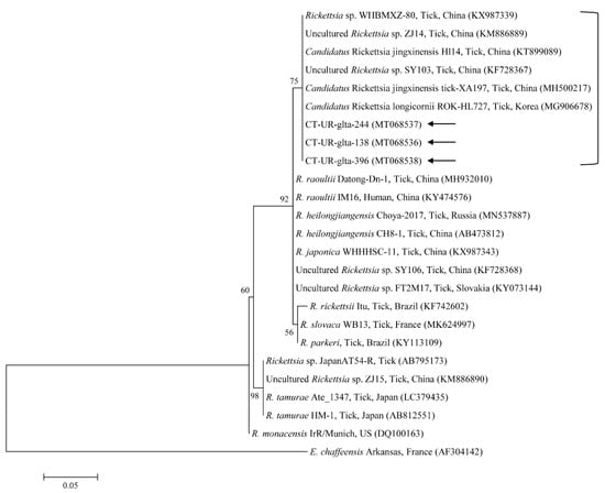 Phylogenetic tree of Rickettsia spp. based on sequences of the gltA gene. The tree was created using the maximum likelihood method. Black arrows show the sequences analyzed in the present study. Ehrlichia chaffeensis was employed as the outgroup. GenBank accession numbers of other sequences are presented with the sequence name. Branch numbers signify the bootstrap support levels (1000 replicates), and the scale bar shows the number of substitutions for each nucleotide.