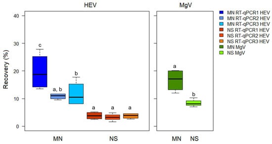 Hepatitis E virus (HEV) recovery in bottled water samples using the ISO 15216-1:2017 procedure and comparing two extraction kits and three RT-qPCRs assays. MN: NucleoSpin®RNA virus kit (Macherey-Nagel GmbH & Co.); NS: NucliSens® MiniMag® system (BioMerieux SA); RT-qPCR1: modified from []; RT-qPCR2: CeeramTools® Hepatitis E Virus Detection KHEV kit (BioMérieux SA); and RT-qPCR3: Described in [] and modified in []. Different letters denote significant differences among methods for each virus (p < 0.05).