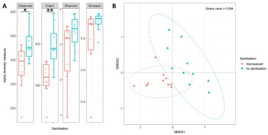 Taxonomic diversity analysis of used kitchen sponges calculated from the abundance table of all sequences at genus level: (A) Alpha diversity measures based on the four most common indices. Box plots show median as well as lower and upper quartiles. Each dot represents an individual sample. Whiskers represent minimum and maximum spread. Statistical analysis was done using ANOVA, and resulting FDR-corrected p-values are displayed as asterisks. The significant codes are p < 0.01 (**), p < 0.05 (*), and ( ) = not significant. (B) nonmetric multidimensional scaling (NMDS) plot using the Bray–Curtis distance measure of analyzed kitchen sponges. Color indicates sanitation treatment: regularly microwaved kitchen sponges (red) and untreated kitchen sponges (blue). Ellipses (dotted lines) represent the 95% confidence interval of each sanitization treatment.