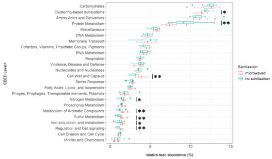 Functional profiles at SEED subsystem level 1 of sanitized and unsanitized used kitchen sponges: For better visualization, only the subsystems with a mean relative abundance greater than 1% are displayed. The boxes show median as well as lower and upper quartiles. Whiskers represent extremes outside upper and lower quartiles. The statistical comparison between microwaved and untreated kitchen sponges was done using Wilcoxon–Mann–Whitney-U tests for independent samples. Asterisks indicate subsystems that, in comparison, show a significant difference in relative abundance. The significant codes are p < 0.01 (**), p < 0.05 (*), and ( ) = not significant.