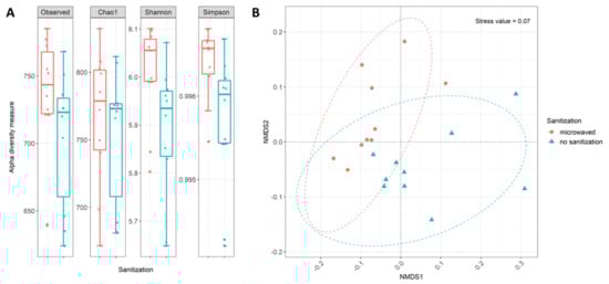 Diversity analysis of used kitchen sponges based on abundance table at SEED subsystem level 3: (A) Alpha diversity measures based one the four most common indices. Box plots show median as well as lower and upper quartiles. Each dot represents an individual sample. Whiskers represent minimum and maximum spread. (B) NMDS ordination for functional properties using the Bray–Curtis distance measures. Color indicates sanitation treatment: regularly microwaved sanitized kitchen sponges (red) and untreated kitchen sponges (blue). Dotted lines display ellipses, which represent the 95% confidence interval of each sanitization treatment.