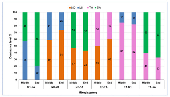 - in three mixed fermentation (M1-SA, ND-M1, TA-SA), a slightly higher prevalence of one strain than the other was found (a ratio of about 40% and 60%);