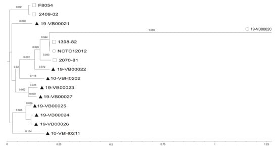 Single nucleotide polymorphism (SNP)-based phylogeny tree of Vibrio cincinnatiensis strains: veterinary isolates (▲), human isolates (О), or isolates of unknown origin (□). SNP tree was conducted using CSIPhylogeny 1.4 under default settings and the exclusion of heterozygous SNPs. Single nucleotide polymorphisms (SNPs) were called by mapping to the V. cincinnatiensis NCTC12012 genome as reference. Scale bar represents the number of nucleotide substitutions per site and numbers indicate branch length (accession numbers for strain F8054: CP046848 and CP046849; for 1398-82: CP046815 and CP046816; for 2070-81: CP046802 and CP046801; and for 2409-02: CP035697 and CP035698).