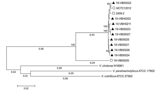 - Farmer, J.J., III; Brenner, F.W.; Cameron, D.N.; Birkhead, K.M.; Janda, J.M. Vibrio . In Bergey’s Manual of Systematics of Archaea and Bacteria, 3rd ed.; Whitman, W.B., Ed.; John Wiley & Sons, Inc.: Hoboken, NJ, USA, in association with Bergey’s Manual Trust; 2015; pp. 1–79. [Google Scholar] [CrossRef]