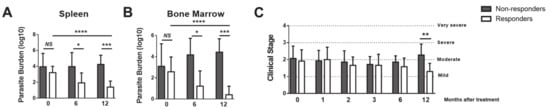 Responder dogs exhibited decreased parasite loads and improved the clinical staging. The canine cohort was separated into responder and non-responder dogs regarding the effect of anti-Leishmania chemotherapy. The parasite burden was quantified by qPCR in the spleen (A) and bone marrow (B) before and at 6- and 12-months post-treatment. The clinical stage of each dog was recorded at the time of the diagnosis (T0) and upon 1 (T1), 2 (T2), 3 (T3), 6 (T6) and 12 (T12) months of treatment (C). Data are shown as mean ± standard deviation (SD), Responder dogs (n = 12) Non responder dogs (n = 14). *p < 0.05; **p < 0.01; ***p < 0.001; ****p < 0.0001.