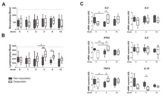 Responder dogs display Th1 signature. The serum absolute numbers of monocytes (A) and lymphocytes (B) was quantified from T0 until 12 months post treatment. mRNA was isolated from spleen biopsies at T0, T6 and T12. Quantitative PCR was performed for IFNG, TNFA, IL2, IL4, IL5 and IL10 (C). Data are shown as mean ± SD or in a box and whisker plot format, Responder dogs (n = 9) Non responder dogs (n = 8) * p < 0.05; ** p < 0.01.