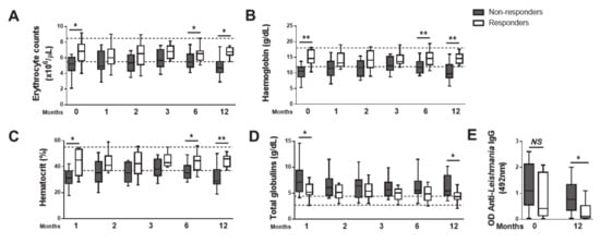 Success of anti-Leishmania therapy is associated with a restoration of erythrocyte, hemoglobin, hematocrit, as well as total and Leishmania-specific globulin values. Erythrocyte number (A) and the values of hemoglobin (B), hematocrit (C), total globulins (D) and anti-Leishmania IgG (E) were quantified in the serum at diagnosis (0) and upon 1, 2, 3, 6 and 12 months of anti-Leishmania treatment. Data are shown as box and whisker plot format, Responder dogs (n = 12), Non responder dogs (n = 14). * p < 0.05; ** p < 0.01.