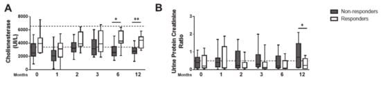 Non-responder dogs develop sub-clinical hepatic and renal lesions. Serum values of cholinesterase (A) and urine protein/creatinine ratio (B) were quantified at T0, T1, T2, T3, T6 and T12. Data are shown as mean ± SD or in a box and whisker plot format, Responder dogs (n = 12), Non responder dogs (n = 14). * p < 0.05; ** p < 0.01.