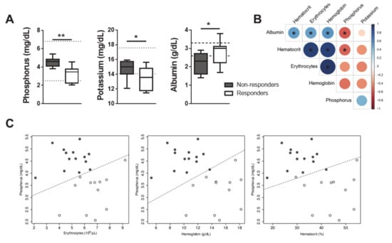 Development of a mathematical model with predictive value for the success of CanL chemotherapy including the measurement of the erythrocyte and phosphorus parameters. (A) The serum values of phosphorous, potassium and albumin were quantified at T0). (B) The Spearman linear correlation coefficient is shown for serum albumin, hematocrit, erythrocytes, hemoglobin, phosphorous and potassium values. (C) Scatterplots between phosphorous and hematocrit or erythrocytes or hemoglobin serum values. Data are shown as mean ± SD or in a box and whisker plot format. Responder dogs (n = 12), Non responder dogs (n = 14). *p < 0.05; **p < 0.01.