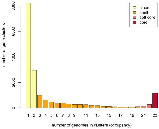GET_HOMOLOGUES [] software was used for the construction of pan-genome. BLASTp [] hits with a minimum of 75% alignment length coverage and an E-value ≤1e-5 were considered. Clustering was performed based on OrthoMCL [] algorithms with inflation parameter of 1.5. The pan-genome was divided into core, soft core, shell, and cloud genes. Core genes are defined as those present in all considered genomes, soft core genes are found in 95% of genomes, shell genes are present in more than 2 genomes and less than 95% of genomes, while cloud genes are found in not more than two genomes [,,].