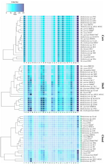 Functional annotation of core, shell, and cloud genes against COG database. Genes were automatically assigned to the following COG categories: A, RNA processing and modification; B, chromatin structure and dynamics; C, energy production and conversion; D, cell cycle control and mitosis; E, amino acid metabolism and transport; F, nucleotide metabolism and transport; G, carbohydrate metabolism and transport; H, coenzyme metabolism, I, lipid metabolism; J, translation; K, transcription; L, replication and repair; M, cell wall/membrane/envelop biogenesis; N, cell motility; O, post-translational modification, protein turnover, chaperone functions; P, inorganic ion transport and metabolism; Q, secondary structure; T, signal transduction; U, intracellular trafficking and secretion; Y, nuclear structure; V, defense mechanisms; Z, cytoskeleton; W, extracellular structures; X, mobilome: prophages, transposons; R, general functional prediction only; S, function unknown. The color key reflects the total number of genes in each COG category.