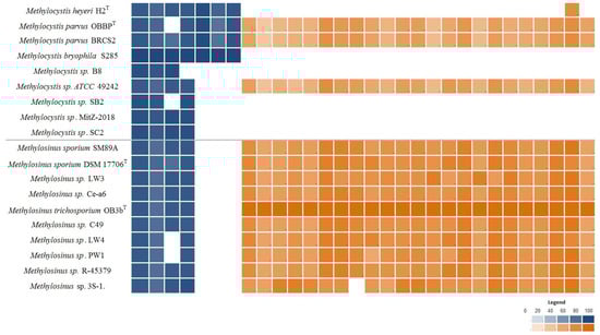Average nucleotide identities across Methylocystis and Methylosinus genomes were estimated using the program «Anvi-compute-genome-similarity» of the Anvi’o platform []. The resulting distance matrices were further visualized as a heatmap.