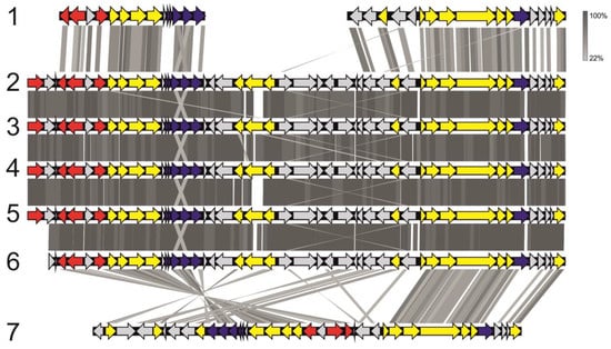 - Sullivan, M.J.; Petty, N.K.; Beatson, S.A. Easyfig: A genome comparison visualizer. Bioinformatics 2011, 27, 1009–1010. [Google Scholar] [CrossRef]