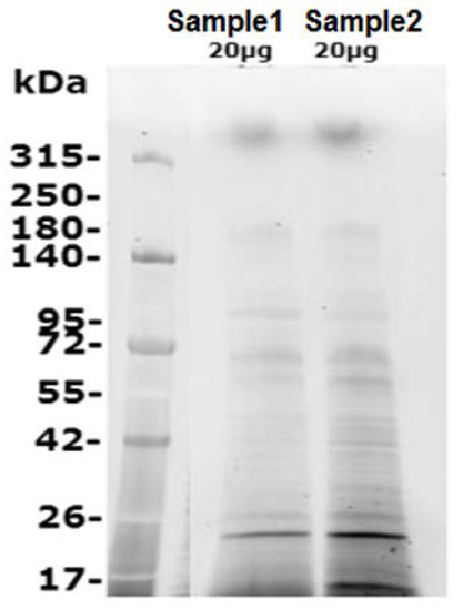 The lysate concentrations of replicates 1 and 2 were estimated using the micro BCA method at 11.6 and 15.6 mg/mL, respectively. A total of 20 μg of each sample were separated on SDS-PAGE gel and proteins were visualized using Stain-Free™ detection (Figure 1).