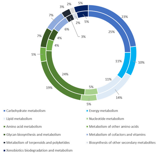 An enrichment analysis with KEGG pathways was performed in order to get a better insight into the biological function and pathways of the expressed genes and proteins. Particularly, the KEGG study made it possible to identify the proteins involved in biochemical metabolism, the signal transduction pathway and genetic information processing. There were 3341 transcripts and 1999 proteins mapped into 368 and 362 KEGG pathways, respectively. Among them, 1173 transcripts and 846 proteins were assigned to metabolic pathways classified into 11 groups (Figure 4).
