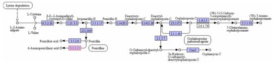 Amoebae cope with a variety of microorganisms in the environment. To survive and defend themselves, they produce a repertoire of several classes of proteins. We identified transcripts and proteins involved in various metabolic pathways related to the biosynthesis of secondary metabolites (Figure S5 and Table S7). Among them was a penicillin amidase transcribed at low level. This enzyme serves for the biosynthesis of penicillin derivatives (Figure 6).