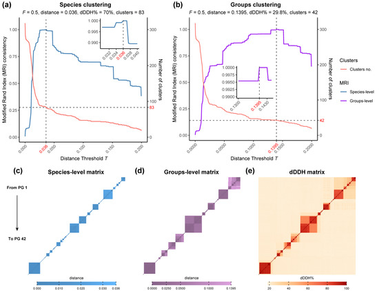 Clustering analysis of 327 Rhodococcus genomes using a range of distance thresholds T. Total cluster consistency (i.e., MRI = 1) was achieved using an average linkage (i.e., F = 0.5) at both species-level (a) and groups-level clusters (b) compared to the reference partition. Clustering was performed with the OPTSIL software v1.5 [37]. Distance matrices (c,d) and digital DNA–DNA hybridization (dDDH) matrix (e) show these clusters from PG 1 (upper-right) to PG 42 (lower-left).