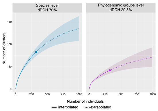 Interpolation and extrapolation analyses of the species and phylogenomic groups clusters were inferred using the iNEXT R package [39], with a bootstrap of 1000 replicates and a confidence interval of 95%.