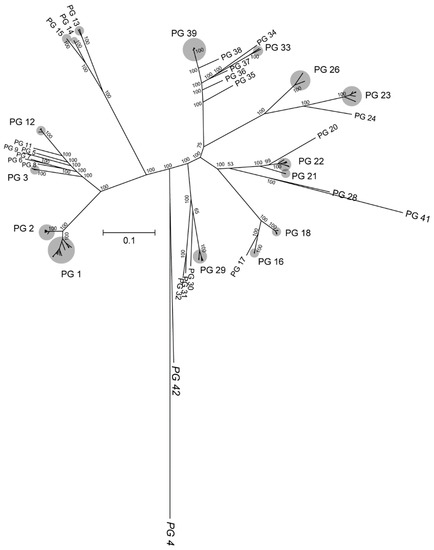 The comparison of 237 strains proteomes resulted in a total of 17,258 orthologous groups (OGs). Among these OGs, 212 appeared in all the genomes as single-copy amino acid sequences. These OGs were used to construct a ML phylogenetic tree shown in Figure 4, whose clustering pattern is consistent with a previous phylogenetic analysis also based on amino acid sequences [20]. The same PGs found in the GBDP-based phylogenomic analysis (Figure 1) are also identified with total bootstrap support using amino acid sequences, which validates the genome clustering reported here. Nonetheless, PGs 4, 28, 41, and 42, all composed of single strains, are distant and separated from their closest PGs compared with the GBDP-based tree, probably due to different evolutionary pressure on the core fraction versus the whole genome content. In the case of PGs 41 and 42, composed of R. rhodnii NBRC 100604T and R. rhodochrous NCTC 630, respectively, the high distance in the single-copy amino acid tree is also observed at the genomic level, being the earliest-diverging groups within the Rhodococcus genus (Figure 1). In addition, PG 41 and PG 28 (R. rhodnii NBRC 100604T and R. triatomae DSM 44892T, respectively) are clustered together in the amino acid-based phylogeny, which agrees with a previous report [20]. In the specific case of PG 4 (composed of Rhodococcus sp. X156 genome), the unusually high GC% content (72.2) of this genome could result in a biased codon usage [52], which might explain the differences between the GBDP-based tree and its high divergence in the amino acid-based phylogeny.