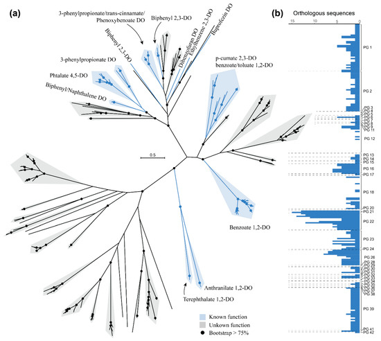 The diversity of Rieske 2Fe-2S dioxygenases has been previously analyzed, either in well-known and characterized sequences from different taxa [67,68] or in environmental samples [69,70]. We used the orthologous group containing these dioxygenases in the Rhodococcus genus to construct a phylogenetic tree, to assess their diversity within the genus. The orthologous group of these dioxygenases contains 567 sequences, of which 339 are not identical and were used to construct the phylogeny (Figure 7a). These sequences include biphenyl 2,3-dioxygenases, naphthalene 1,2-dioxygenases, ethylbenzene 2,3-dioxygenases, phthalate 4,5-dioxygenases, 3-phenylpropionate dioxygenases, benzoate 1,2-dioxygenases, and other dioxygenases with known substrates (Figure 7a). Surprisingly most of the sequences constitute large and very diverse groups without known function/substrate annotated to date. All the sequences involved in the degradation of peripheral substrates (biphenyl, naphthalene, and ethylbenzene, among others) clustered together, along with certain groups of proteins with unknown substrate. Other groups of sequences involved in central aromatic metabolism (benzoate) or central nodes in aromatic degradation pathways (p-cumate, anthranilate, and terephthalate) also form distinct clusters. From the total of 339 unique sequences analyzed, the substrates of more than 200 remain unknown.