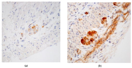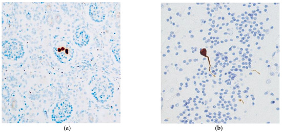 CMV-positive cells in kidney (a) and brain (b) (CMV-IHC; 4HPF) related to a widespread infection.