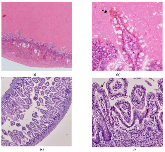 Regarding the intestine, two fetuses investigated macroscopically showed dilatation of the distal intestine and meconium was thickened, dark green and adherent to the intestinal mucosa. Microscopically, the small intestine was markedly dilated, the lumen contained inspissated meconium which compressed the intestinal wall with flattened villi (Figure 2a). The enterocytes showed brown pigments in the cytoplasm, compatible with meconium absorption (Figure 2b). As comparison, a normal intestinal wall was shown in Figure 2c,d.