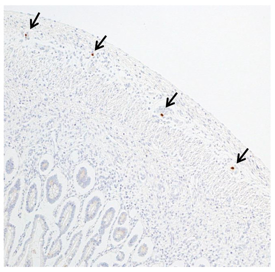 Scattered CMV-positive ganglion cells in Meissner’s submucosal plexus and in endothelial cells were observed. However, no evidence of necrosis and apoptosis were found in the intestinal wall.
