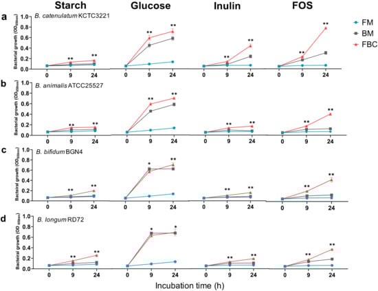 Growth of F. prausnitzii ATCC 27768 with different Bifidobacterium species in liquid culture in the presence of various carbohydrates. Culture OD650 was determined at various time points after inoculation. F. prausnitzii growth in monoculture and co-culture with B. catenulatum KCTC 3221 (a), B. animalis ATCC 25527 (b), B. bifidum BGN4 (c), and B. longum RD72 (d) is shown. All growth experiments were performed in the YCFA medium without SCFA supplemented with starch, glucose, inulin, or FOS, for 24 h. The data are presented as the mean ± standard deviation (n = 4). Statistically significant differences vs. FM group are denoted (* p < 0.05, ** p < 0.01). FM, monoculture of F. prausnitzii; BM, monoculture of Bifidobacterium; FBC, co-culture of F. prausnitzii and Bifidobacterium.