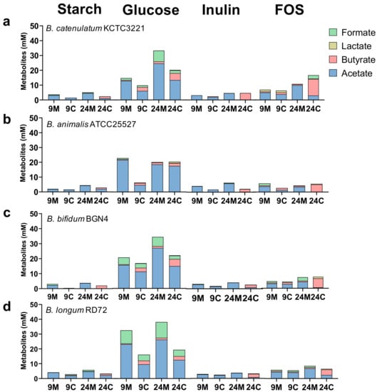 Production of SCFA by bacteria in monoculture and co-culture. Concentrations of SCFA (acetate, lactate, formate, and butyrate) were determined 9 and 24 h after inoculation. Data for F. prausnitzii in monoculture and in co-culture with B. catenulatum KCTC 3221 (a), B. animalis ATCC 25527 (b), B. bifidum BGN4 (c), and B. longum RD72 (d) are shown. All experiments were performed in YCFA medium without SCFA supplemented with starch, glucose, inulin, or FOS. The data are presented as the mean (n = 3). 9M, metabolites from F. prausnitzii and Bifidobacterium monocultures after 9 h; 9C, metabolites in F. prausnitzii and Bifidobacterium co-culture after 9 h; 24M, metabolites from F. prausnitzii and Bifidobacterium monocultures after 24 h; 24C, metabolites in F. prausnitzii and Bifidobacterium co-culture after 24 h.