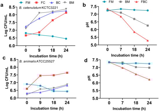 Changes in the viable cell number and pH of cultures of F. prausnitzii and B. catenulatum KCTC 3221 or B. animalis ATCC 25527 in YCFOS medium. Data for F. prausnitzii in monoculture or co-culture with B. catenulatum KCTC 3221 (a,b) or B. animalis ATCC 25527 (c,d) in YC medium supplemented with FOS are shown. Samples were analyzed at the indicated time intervals. Cell numbers were determined by viable counts, as CFU/mL, after plating on LYBHI agar (a,c). The pH changes are plotted in (b,d). The data are presented as the mean ± standard deviation (n = 3). FM, F. prausnitzii in monoculture; BM, Bifidobacterium in monoculture; FC, F. prausnitzii in co-culture; BC, Bifidobacterium in co-culture;FBC, co-culture of F. prausnitzii and Bifidobacterium.