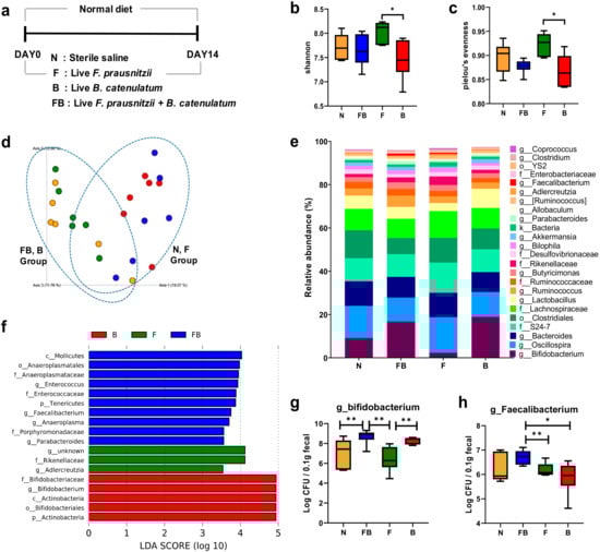 Fecal microbial composition in normal C57B6 mice fed F. prausnitzii and B. catenulatum. The microbiome was analyzed in mouse stool samples (6 mice per group). The mice were administered live bacteria or saline for 14 d (a). The alpha-diversity indices of microbial community richness and evenness are shown in (b) and (c). The beta-diversity based on the Bray-Curtis distance is shown in (d). The average relative abundance at the genus level (taxa with relative abundance >0.5%) is shown in (e). Significantly different taxa in the B (red), F (green), and FB (blue) groups, determined by LEfSe analysis (threshold >2.0), are shown in (f). The abundance of F. prausnitzii (g) and Bifidobacterium (h) in the feces was detected by RT-qPCR. Statistically significant differences are shown (* p < 0.05, ** p < 0.01). N, normal mouse; FB, mice administered F. prausnitzii (1 × 109 CFU/mL) and B. catenulatum (1 × 109 CFU/mL); F, mice administered F. prausnitzii (1 × 109 CFU/mL); B, mice administered B. catenulatum (1 × 109 CFU/mL).