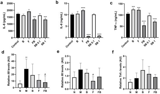 Immunomodulatory effects of bacterial culture supernatants in vitro (a–c) and in vivo (d–f). (a–c) In vitro effect of the culture supernatants: effect on the secretion of IL-8 by LPS-stimulated HT-29 cells (a), and on the secretion of IL-6 (b) and TNF-α (c) by LPS-stimulated RAW 264.7 macrophages. In a–c, the cells were exposed to sodium butyrate as the positive control. The cells were stimulated with 100 ng/mL LPS prior to the experiment, and cytokine levels were determined by using commercial enzyme-linked immunosorbent assay kits. (d–f) In vivo effect of the culture supernatants: relative mRNA levels determined by RT-qPCR for the genes of proinflammatory cytokines, Il8, Il6, and Tnf-α, in the colon of DSS-induced colitis mice. All data are shown as the mean + standard deviation. (a–c) Control, 10% YCFOS medium; B, 10% supernatant of B. catenulatum culture; F, 10% supernatant of F. prausnitzii culture; FB, 10% supernatant of F. prausnitzii and B. catenulatum co-culture medium; SB 0.1, 0.1 mM sodium butyrate; SB1, 1 mM sodium butyrate. Significant differences compared with the control group, *** p < 0.001, **** p < 0.0001 (n = 3). (d–f) N, untreated mice; M, DSS-induced colitis mice administered with culture medium control; B, DSS-induced colitis mice administered with medium from B. catenulatum culture; F, DSS-induced colitis mice administered with medium from F. prausnitzii culture; FB, DSS-induced colitis mice administered with medium from F. prausnitzii and B. catenulatum co-culture. Significant differences compared with the N group, ** p < 0.01; compared with the M group, # p < 0.05 (n = 6).